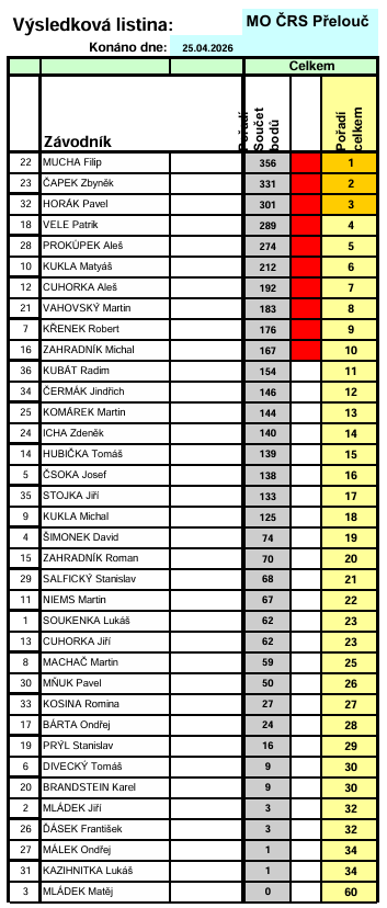 V sobotu 25. 4. 2026, proběhly na revíru Komora rybářské závody pro dospělé Přeloučský kapr. Závodu se zúčastnilo celkem 36 závodníků. Pro závodníky byla připravena pročištěná místa s dobrým přístupem a díky MO ČRS Přelouč byla voda před závody zarybněna kaprem. Pro závodníky bylo připraveno občerstvení a mnoho hodnotných cen.