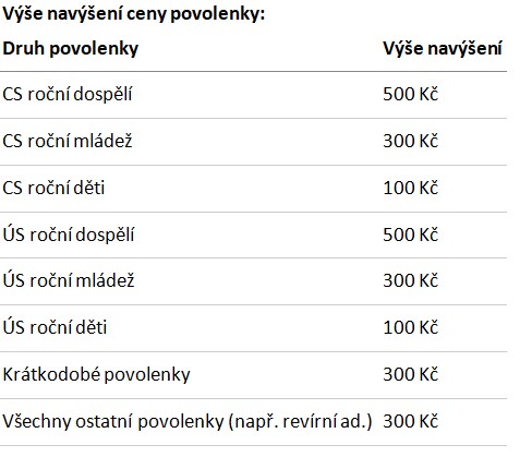 | Druh povolenky | Věková kategorie | 7 denní | měsíční | roční |